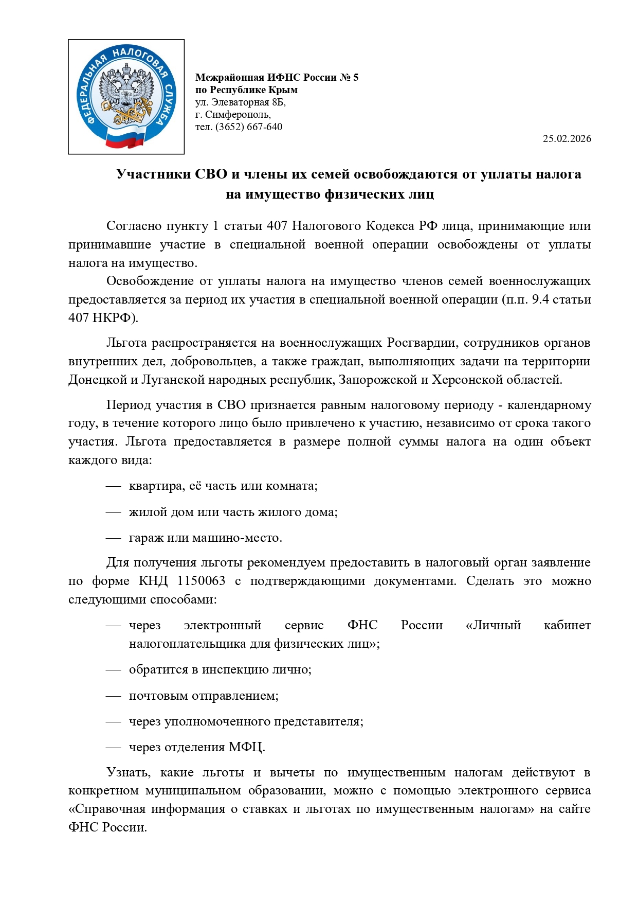 Участники СВО и члены их семей освобождаются от уплаты налога на имущество физических лиц